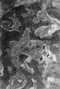 骨折愈合过程的进一步发展,是骨母细胞产生新生骨质逐渐取代上述纤维性骨痂。开始形成的骨质为类骨组织(图17-1),以后发生钙盐沉着,形成编织骨(woven bone),即骨性骨痂(图17-2)。纤维性骨痂内的软骨组织,和骨发育时的软骨化骨一样,发生钙盐沉着而演变为骨组织,参与骨性骨痂的形成。此时所形成的编织骨,由于其结构不够致密,骨小梁排列比较紊乱,故仍达不到正常功能需要。