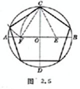 [已知外接圆作正五边形] 过圆心O作互相垂直的直径AB,CD,平分OB于E,以E为圆心,EC为半径画弧交OA于F,以CF为半径在圆周上顺次截段并连接各点,即为所求正五边形(图2.5).也可参考正十边形作法(见图2.11中的虚线).