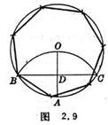 [已知外接圆作正七边形(近似作法)] 以圆周上任一点A为圆心,以同圆半径为半径画弧交圆周于B,C,连接BC,AO,交于D.以BD为半径(作图时应略大于BD)在圆周上顺次截段,并连接各点,即为所求正七边形(图2.9).
