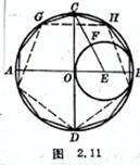 [已知外接圆作正十边形] 过圆心O作互相垂直的直径AB,CD,以OB为直径画圆E,连接EC交E圆于F.以CF为半径在圆周上顺次截段,并连接各点,即为所求正十边形(图2.11).