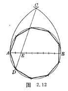 [已知外接圆作任意正多边形(近似作法)] 将直径AB n等分(n为边数),以A,B为圆心,AB为半径画弧交于C,连接C与第二个分点E,并延长交圆于D,以AD为半径在圆周上顺次截段,并连接各点,即为所求正n边形(图2.12中为正九边形).
