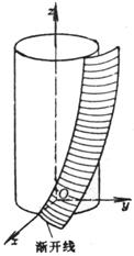 [渐开线螺旋面]        Oxy平面上一条已知渐开线绕z轴作螺旋运动而形成的曲面称为渐开线螺旋面(图7.21)其方程为
