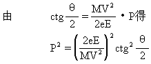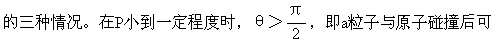 a粒子的散射】 1911年卢瑟福等人用a粒子(He的原子核)射击重的金属箔,结果大部分a粒子穿过了金属箔而很少改变其运动方向,一少部分a粒子被分别散射到不同的方向上。他们测定了不同散射角中a粒子的数目,加以分析后,得出如下结论:原子是由一个很小的核心(原子核)和围绕着它运动的电子构成(原子行星模型),原子核所带电荷量为ZeZ为该金属的原子序数,e为电子的电荷),其线度约为原子的十万分之一,一般为10-1310-12厘米,a粒子散射,又称为卢瑟福散射,它是原子物理发展中最早期的重要实验之一。图5-1所示描述了a粒子通过重金属箔的散射情况。假设距原子核很远的地方,a粒子沿直线ab以速度V运动,以P表示直线ab与原子中心O(即原子的正电荷E所在的地方)的最短距离。P被称为“瞄准”距离,可由理论力学应用电学知识计算证明,在a粒子与电荷E之间存在着库仑相互作用力的情况下,a粒子沿双曲线运动。而a粒子轨道的偏转角θ(双曲线的渐近线之间的角)为下式决定: