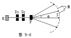 a粒子散射装置】早期的a粒子散射的实验装置如图5-6所示。R为放在铅室中的放射源,D1D2为限束光栏(目的是为了形成细束),F为金属箔上通过来的位置,S为一荧光屏,M为放大镜。每当a粒子打到荧光屏上时,就有荧光闪烁,通过放大镜观察和计数荧光闪烁的次数,从而测定a粒子束在该处的强弱。SM可以同步地在以F为圆心的圆弧上移动。在不同的散射角度上测a散射的粒子数是不相同的,利用这些散射粒子的能量和不同角度上的分布,可以研究不同的物质的性质。这种装置是很简单的。近期的a粒子散射实验装置中,多用加速器把a粒子(氦原子核)加速到一定能量并准直为细束,打到要研究的金属箔上,其探测装置,也多用半导体探测器代替荧光屏和放大镜。探测器可以,记录a粒子的数量,通过多道分析器还能定出各种a粒子的能量,测出按能量分布的能谱。a粒子的散射有的散射角大于90°,对于大于90°角的散射,常称之为“背散射”。对于要研究的样品不是薄片而是比较厚的样片,a粒子不能穿过,要研究其表面的性质。多用背散射进行研究。在背散射的分析中,可以用加速器来精确地控制a粒子的能量,使a粒子和靶核的作用在弹性碰撞范围之内,这就可以用经典理论来分析。利用加速器作a粒子源其主要优点是:(1a粒子的能量单色性好。(2a粒子的能量可调整到所需要的能量。 3)可以做高能量的a粒子实验。大大改善了早期a粒子散射实验的精度。近年来,a粒子背散射技术有了更大的发展,特别是在半导体领域中,由于工业生产的发展迫切要求了解半导体表面1μm(微米)内杂质的纵剖面分布、晶体损伤和杂质原子的晶格定位等。背散射技术及沟道效应的应用,正好满足这些要求。此外这种分析方法是定量的,可靠的,对样品非破坏性的分析,尤其是对轻衬底中的重元素杂质的分析,因此这种分析技术得到了很快的发展,成为表面分析的有利工具。