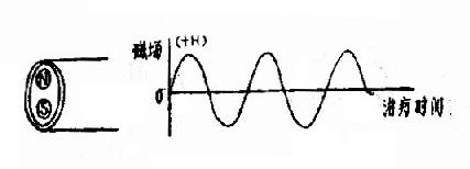 图6.4 恒定磁场 2.交变磁场 磁场强度和方向在规律变化的磁场(图6.5),如工频磁疗机和异极旋转磁疗器产生的磁场。 3.脉动磁场 磁场强度有规律变化而磁场方向不发生变化的磁场(如图6.6),如同极旋转磁疗器、通过脉动直流电磁铁产生的磁场。 4.脉冲磁场 用间歇振荡器产生间歇脉冲电流,将这种电流通入电磁铁的线圈即可产生各种形状的脉冲磁场。脉冲磁场的特点是间歇式出现磁场,磁场的变化频率、波形和峰值可根据需要进行调节。 恒磁场又称为静磁场,而交变磁场,脉动磁场和脉冲磁场属于动磁场。磁场的空间各处的磁场强度相等或大致相等的称为均匀磁场,否则就称为非均匀磁场。离开磁极表面越远,磁场越弱,磁场强度呈梯度变化。