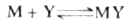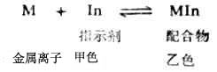 Z代表其他配合剂,n为Z的系数。由于其他配合剂的存在,降低了金属离子的浓度,使平衡向左移动。配合滴定中常常利用这个原理消除干扰离子。例如,用EDTA滴定Mg2+和Cd2+、Zn2+混合液中的Mg2+时,可在滴定前向混合液中加入KCN,使Cd2+和Zn2+与CN-形成稳定的[Zn(CN)4]2-和[Cd(CN)4]2-(Mg2+不与CN-配合),从而消除了Cd2+和Zn2+对滴定的干扰。这种消除干扰的作用叫掩蔽作用,起掩蔽作用的配合剂叫掩蔽剂。 (二)金属指示剂 配合滴定中指示终点的方法很多,其中最重要、应用最多的是金属指示剂。它常常是一种配合剂,能与金属离子形成可溶于水的有色配合物。