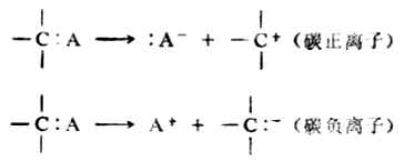均裂往往借助于较高的温度或光的照射。 由均裂生成的带有未成对电子的原子或原子团叫自由基或游离基。有自由基参加的反应叫做自由基反应。这种反应往往被光、高温或过氧化物所引发。自由基反应是高分子化学中的一个重要的反应,它也参与许多生理或病理过程。 (二)异裂 共价键断裂后,其共用电子对只归属于原来生成共价键的两部分中的一部分。这种键的断裂方式叫做异裂。它往往被酸、碱或极性溶剂所催化,一般在极性溶剂中进行。 碳与其它原子间的σ键断裂时,可得到碳正离子或碳负离子: