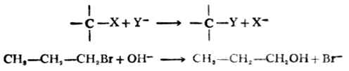 通过共价键的异裂而进行的反应叫做离子型反应,它有别于无机化合物瞬间完成的离子反应。它通常发生于极性分子之间,通过共价键的异裂而完成。 路易斯酸碱概念可以帮助我们对离子型反应的理解。按照路易斯的定义,接受电子对的物质为酸,提供电子对的物质为碱。 碳正离子和路易斯酸是亲电的,在反应中它们总是进攻反应中电子云密度较大的部位,所以是一种亲电试剂。碳负离子和路易斯碱是亲核的,在反应中它们往往寻求质子或进攻一个荷正电的中心以中和其负电荷,是亲核试剂。由亲电试剂的进攻而发生的反应叫亲电反应;由亲核试 剂的进攻而发生的反应叫亲核反应。 有机化学反应还可根据产物与原料之间的关系分为取代反应、加成反应、消去反应、异构化反应和氧化还原等五种反应类型。 1.取代反应 连接在碳原子上的一个原子或官能团被另一个原子或官能团置换的反应叫取代。在反应中,该碳原子上有一个σ键断裂和一个新的σ键生成。
