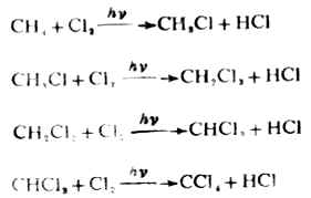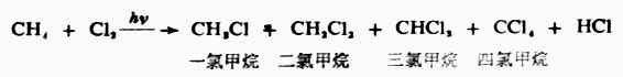 在漫射的日光下则起一般的氯化反应,生成一氯甲烷、二氯甲烷、三氯甲烷(俗称氯仿)和四氯化碳。