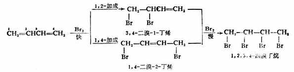 1,4-二溴-2-丁烯 加第一分子溴的速率要比加第二分子溴快得多,反应常常终止在二溴代物阶段。而且生成的二溴代物也不是一种而是两种:3,4-二溴-1-丁烯和1,4-二溴-2-丁烯。3,4-二溴-1-丁烯是由溴和一个双键加成而生成的1,2-加成产物。1,4-二溴-2-丁烯是溴加在共轭双键两端而生成的1,4-加成产物。 1,3-丁二烯与1molHX加成时,也得到1,2-及1,4-加成产物。 共轭二烯烃的1,2-与1,4-加成产生的比例决定于反应条件。通常在较低温度及非极性溶剂中,有利于1,2-加成,在较高温度及极性溶剂中,有利于1,4-加成。例如,用己烷为溶剂时,在-15℃进行反应,1,3-丁二烯与溴 的1,2-加成产物占54%,1,4-加成产物占46%;如在60℃时反应,则1,4-加成产物占70%。