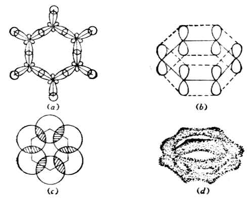多年来,人们对于苯提出了多种构造式,但还没有一种能比较完善地表示它的结构。 经过现代物理方法的研究,证明苯分子中的六个碳原子都是sp3杂化的。每个碳原子各以两个sp2杂化轨道分别与另外两个碳原子形成C-Cσ键。这样六个碳原子构成了一个正六边形的环状结构。每个碳原子上的另一个sp2轨道,其电子云的对称轴在正六边形的平面上,这个sp2杂化轨道与氢原子的1s轨道,其电子云的对称轴在正六边形的平面上,这个sp2杂化轨道与氢原子的1s轨道形成C-Hσ。因此苯人子中的所有原子都在一个平面上,键角都是120°[图12-(a)],每个碳原子还有一个未参与杂化的pz杂化轨道[图12-(b)],它的对称轴垂直于此平面,能与相邻的两个碳原子上的pz轨道分别从侧面平行重叠,形成了一个闭合的共轭体系[图12-5(c)],在这个体系中,环上有六个碳原子和六个π电子,离域的π电子云完全平均化,体系能量低,比较稳定。π电子云成两个轮胎状[图12-5(d)],均匀分布在苯环平面的上下两侧。苯分子中的碳-碳键长也完全平均化,都是0.1393nm。这种具有6π电子闭合共轭体系,使得苯环具有高度的对称性和特殊的稳定性。由于形成了闭合共轭体系,无单、双键之分,故苯的邻位二元取代物只能有一种。