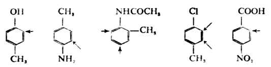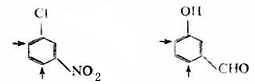 这类定位取代基的特征是,取代基中直接与苯环相连的原子一般都含有不饱和键或带有正电荷。 苯环的取代规律在实际应用上很有意义,因为掌握了这个规律,就可以预知取代反应中的主要产物。 取代定位规律并不是绝对的。实际上在生成邻位及对位产物的同时,也有少量间产物生成;在生成间位产物的同时,也有少量的邻位和对位产物生成。例如当甲苯在0℃下磺化时,除生成52.5%的对甲基磺酸和42.7%的邻甲基苯磺酸外,还生成3.8%的间甲基苯磺酸。 (三)二取代苯的取代定位规律 如果苯环上已经有了两个取代基,当引入第三个取代基时,影响第三个取代基进入的位置的因素较多。定性地说,两个取代基对反应活性的影响有加和性。人们从实际工作中得出了以下的经验规律: 1.苯环上已有两个邻对位定位取代基或两个间位定位取代基,当这两上定位取代基的定位方向有矛盾时,第三个取代基进入的位置,主要由定位作用较强的一个来决定。如果两上定位取代基的作用强度相近,将得到数量相近的异构体。例如,下列化合物进行亲电取代反应时,第三个取代基主要进入的位置用“→”表示。