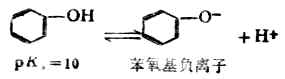 二、酚的化学性质酚的羟基直接与苯环的sp2杂化的碳原子相连,这与脂肪族化合物中的烯醇很相似。另外,由于 酚的羟基氧原子的未共享电子对与苯环的共轭作用,不但使苯酚成稳定化合物,而且也有利苯酚的离解。 (一)弱酸性 酚比醇的酸性强,是由于酚式羟基的O-H键易断裂,生成的苯氧基负离子比较稳定,使苯酚的离解平衡趋向右侧,而表现弱酸性。酚式羟基的氢除能被金属取代外,还能与强碱溶液生成盐(如酚钠)和水。