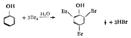 2C6H5OH+Na→2C6H5ONa+H2↑ C6H5OH+NaOH→C6H5ONa+H2O 若在苯酚钠的水溶液中通入二氧化碳,即有游离苯酚析出。这是因为苯酚酸性比碳酸弱,所以酚盐能被碳酸所分解。 C6H5OHa+CO2+H2O→C6H5OH+NaHCO3 由于酚的酸性弱于碳酸,所以酚只能溶于氢氧化钠而不溶于碳酸氢钠。实验室里常根据酚的这一特性,而与既溶于氢氧化钠又能溶于碳酸氢钠的羧酸相区别。此方法也可用于中草药中酚类成分与羧酸类成分的分离。 (二)与氯化铁的反应 大多数的酚能与氯化铁的稀水溶液发生显色反应。不同的酚与氯化铁反应呈显不同的颜色。例如,苯酚、间苯二酚、1,3,5-苯三酚与氯化铁溶液作用,均显紫色;甲苯酚呈蓝色;邻苯二酚、对苯二酚呈绿色;1,2,3-苯三酚呈红色,α-萘酚为紫色沉淀,β-萘酚则为绿色沉淀等。此显色反应常用以鉴别酚类的存在。 具有 构造的烯醇型化合物也能与氯化铁溶液发生颜色反应。 一般的醇式羟基无此反应,故也可用来区别醇与烯醇。 (三)苯环上氢原子的取代反应 苯环连有羟基后,环的活泼性就增加,易起取代反应,取代基一般都进入羟基的邻对位及对位。例如苯的卤化反应一般较难进行,需要加热及催化剂,但苯酚的卤化就容易得多。在室温下加溴水于苯酚中,立即生成2,4,6-三溴苯酚的白色沉淀,此反应较灵敏,少量的苯酚也能检出。