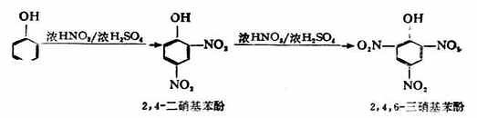 苯酚也易硝化,使用稀硝酸即可生成邻硝基苯酚和对硝基苯酚的混合物。如使用浓硝酸和浓硫酸的混合物作硝化剂则可生成二硝基苯酚或三硝基苯酚。2,4,6-三硝基苯酚俗称苦味酸,酸性比苯酚强得多。