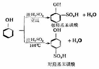 浓硫酸容易使酚磺化。室温下,产物为邻羟基苯磺酸,在100℃时主产物是对羟基苯磺酸。