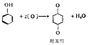 (四)氧化反应 酚类易被氧化,但产物复杂。纯苯酚系无色结晶,在空气中放置后,就能逐渐氧化变为粉红色、红色或暗红色。苯酚如用酸性重铬酸钾强烈氧化,则生成对苯醌。