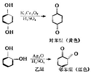 邻苯二酚和对苯二酚比苯酚更容易被氧化成相应的醌,但间苯二酚不能被氧化为相应的醌。醌是一般都具有颜色。