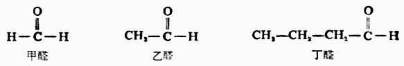 二、醛和酮的命名(一)普通命名法 简单的脂肪醛按分子中的碳原子的数目,称为某醛。例如: