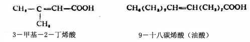 不饱和脂肪酸命名时,主链应是包括羧基碳原子和各碳碳重键的碳原子都在内的最长碳链,从羧基碳原子开始编号,并注明重键的位置。例如:
