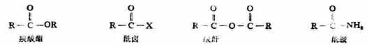 和脂肪酸中,与羧基相连的烷基具有供电诱导效应(+I),使羧基上的氢较难离解,酸性较甲酸弱(表16-3中的1,2)。当卤素取代羧酸分子中烃基上的氢后,由于卤原子的吸电子诱导效应(-I),酸性增强(表16-3中的3,6,7,8)。烃基某个碳上引入的卤原子的数目越多,酸性越强(表16-3中的3,4,5及8,9)当卤原子相同时,卤原子距羧基越近,酸性越强(表16-3中的11,12,13)。当卤原子的种类不同时,它们对酸性的影响是F>CL>Br>I。所以氟乙酸的酸性>氯乙酸>溴乙酸>碘乙酸(表16-3中的3,6,7,8)。 (二)羟基被取代的反应 羧酸中的羟基可以被其它原子或原子团取代,生成羧酸衍生物。例如: