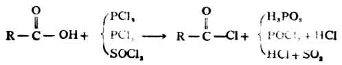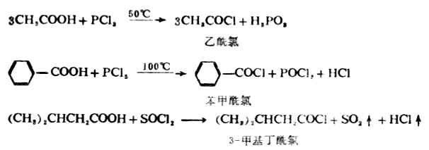 2.酰卤的生成 羧酸(除甲酸外)能与三卤化磷、五卤化磷或亚硫酰氯(SOCL2)反应,羧基中的羟基被卤素取代生成相应的酰卤。