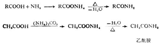 4.酰胺的生成 在羧酸中通入氨气或加入碳酸铵,可以得到羧酸的铵盐。将固体的羧酸铵加热,分子内失去一分子水生成酰胺。