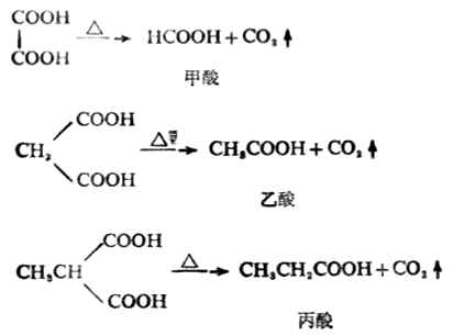生物体内发生的许多重要的脱羧反应是在脱羧酶的作用下进行的。 有些二元酸对热不稳定,在加热或与脱水剂共热的条件下,随两个羧基间距不同而发生脱羧反应或脱水反应,这是二元羧酸的特性。 1.乙二酸和丙二酸 乙二酸或丙二酸加热脱羧生成一元羧酸。