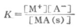 [MA(s)]是常数,可以并入常数项中,得到 [M+][A-]=K[MA(s)]=Ksp (2-8) 式(2-8)表明:在微溶电解质的饱和溶液中,温度一定时,各离子浓度幂之乘积为一常数,称为溶度积常数,简称溶度积。用符号Ksp表示。 对于MmAn型电解质来说,溶度积的公式是 [M]m[A]n= Ksp (2-9) 须注意,式(2-9)中省略了离子的电荷。 表2-7列出了一部分微溶电解质的溶度积。溶度积的大小取决于微溶电解质的本性,它随温度的升高而升稍微增大。 表2-7 一些微溶电解质的溶度积(18~25℃)