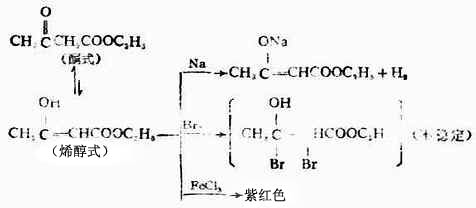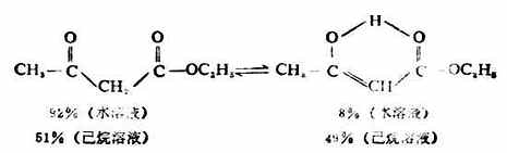 实际上,乙酰乙酸乙酯是其酮式构造与烯醇式构造的平衡混合物。在水溶液中,酮式占优势。 如将此平衡混合物溶解在石油醚中,冷至-78℃,可以得到酮式的晶体。如将平衡混合物与金属钠反应生成的烯醇钠,在-78℃,可以得到酮式的晶体。但是,无论是将酮式的晶体或烯醇式的油状液放置一定时间,或用适当溶剂溶解后再放置,都将成为酮式与烯醇式的平衡混合物。 乙酰乙酸乙酯的酮式与烯醇式是构造异构体,二者的差别仅在于一个双键及一个质子的位置不同。在酮式中是C=O双键,质子连在羧酸酯基的α碳上;在烯醇式中是C=C双键,质子连在羧酸酯基的β碳所连的羟基中。酮式与烯醇式之间很容易相互转化,只要有痕量的酸或碱,甚至玻璃容器的器壁,都能促其转变,建立平衡。因此,把这种构造异构现象叫做互变异构。乙酰乙酸乙酯的酮式与烯醇式异构称为酮式-烯醇式互变异构。 凡含 α-H碳基化合物都有酮式-烯醇式互变异构。酮式与烯醇式的比例与其分子构造及介质等有关。在醛或酮中也有酮式-烯醇式互变异构平衡存在,羰基的α-H作为质子转移,不过在平衡混合物中,烯醇所占的比例太小。