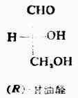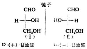 三、含一个手性碳原子的分子含一个手性碳原子的化合物有一对对映异构体。 (一)外消旋体 两个对映体的等物质的量混合物的比旋亮度为零。这种混合物叫做外消旋体。与各对映体相比较,外消旋体无旋旋光性外,其理化性质也不同,它的生理或药理作用与各对映体往往有明显的差异。 除了用特殊方法外,用通常化学合成的具手性碳原子的化合物,基本上是外消旋体。要想从外消旋体得到旋光纯的异构体,要采用特定的方法把左旋体与右旋体分开,这个过程叫做拆分。 (二)对映异构体的构型 1. 为了方便起见,对映异构体的构型通常采用费歇尔投影式来表示,即把手性碳原子所连的四个原子或原子团按规定的方法投影到纸上。这种方法包括:(1)手性碳原子写在纸平面上,或用一个“+”字形的交叉点代表这个手性碳,四端分别连四个不同的原子或原子团;(2)以垂直与手性碳相连的是伸向纸平面手后方的两个原子或原子团,以水平线与手性碳原相连的是伸向纸平面前方的两上原子或原子团;(3)通常把碳链放在垂直线上,并把命名时编号最小的碳原子放在上端。费歇尔投影式是以两维式来表示含手性碳原子的分子的三维结构。 2.相对构型与绝对构型 物质分子中各原子或原子团在空间的实际排布叫做这种分子的绝对构型。现在已能用X射线衍射等方法测定了许多化合物分子的绝对构型,但在1951年以前还没有解决这个问题。1906年,罗沙诺夫建议把(+)-及(-)-甘油醛作为其他旋光性异构体物质的构型的比较标准,并人为地规定,在费歇尔投影式中,手性碳上的OH排在横线右边的为右旋甘油醛(Ⅰ),作为D型,手性碳上的OH排在横线左边的为左旋甘油醛(Ⅱ),作为L型。D-及L-分别表示它们的构型。应注意,D及L仅表示其构型,与其旋光性(+)、(-)无关。当一个旋光性物质发生化学反应时,只要手性碳上的任何一个键都未断裂,则这个手性碳的构型就没有改变。这样,许多其他物质分子的构型都可以通过直接或间接的化学转变,与D型或L型甘油醛相联系,其条件是相当于甘油分子的手性碳上的每一个键,在转变过程中都不发生断裂。如果该物质与D型甘油醛相联系时,其分子的构型即为D型,如与L型甘油醛相关联时,它的分子构型则属于L型。用这种方法确定的构型是相对于标准物质——甘油醛而来的,所以叫做相对构型。