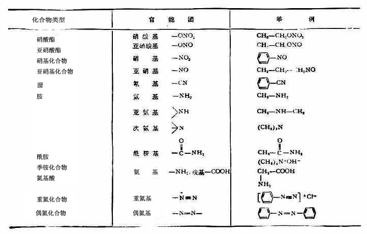 中的一个或几个氢原子被含氮的官能团所取代的衍生物。这类化合物范围广,种类繁多,与生命活动和人类日常生活关系非常密切。常见的比较简单的含氮有机化合物如表18-1。