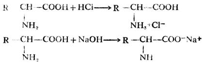 二、氨基酸的性质α-氨基酸都是无色晶体,熔点一般都较高(常在230-300℃之间),熔融时即分解放出二氧化碳。 α-氨基酸都能溶于酸性或碱性溶液中,但难溶于乙醚等有机溶剂。在纯水中各种氨基酸的溶解度差异较大,加乙醇能使许多氨基酸从水溶液中沉淀析出。 (二)化学性质 氨基酸分子内既含有氨基又含有羧基,因此它们具有氨基和羧基的典型性质。但是,由于两种官能团在分子内的相互影响,又具有一些特殊的性质。 1.两性 氨基酸分子中既有碱性-NH2和酸性-COOH,与强酸或强碱都能作用生成盐,因此氨基酸为两性化合物。