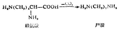 脱羧反应也可在蛋白质腐败时发生。例如在某些细菌作用下,蛋白质中的赖氨酸可变成毒性很强的尸胺(戊二胺)。
