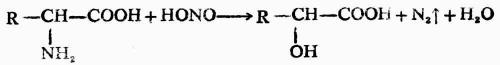 5.与亚硝酸的反应 氨基酸中的氨基具有伯胺的性质,与亚硝酸作用时生成羟基酸,同时定量的放出氮气。