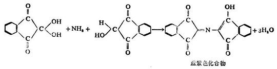 6.与茚三酮的显色反应 α-氨基酸与茚三酮的水合物在水溶液中加热时,生成蓝紫色或紫色化合物,同时产生醛、二氧化碳和氨。这个反应非常灵敏,是鉴定氨基酸最迅速、最简单的方法,常用于α-氨基酸的比色测定或纸层析、薄层层析时的显色。