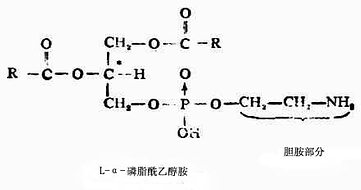 自然界的磷脂酰胆碱是几种磷脂酰胆碱的混合物,主要是组分中的脂肪酸不同,经水解后得到甘油、脂肪酸、磷酸和胆碱。常见于磷脂酰胆碱中的脂肪酸有棕榈酸、硬脂酸、油酸、亚油酸、亚麻酸及花物四烯酸等。某些毒蛇的毒汁中含有一种磷脂酶,能使β位脂肪酰基水解脱落,生成溶血磷脂酰胆碱,从而破坏了细胞膜,引起溶血。 (二)磷脂酰乙醇胺(脑磷脂) 磷脂酰乙醇胺在脑组织中含量甚多,故又称脑磷脂。它和磷脂酰胆碱并存于机体各组织及器官中,它的构造和理化性质均与磷脂酰胆碱相似,只是在磷脂酰乙醇胺中,与磷酸结合的是胆胺(HO=CH2-CH2-NH2)。