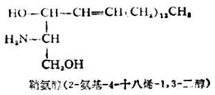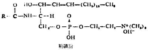 磷脂酰乙醇胺性质与磷脂酰胆碱相似,也不稳定,易吸收水分,在空气中氧化成棕黑色。磷脂酰乙醇胺能溶于乙醚,但难溶于乙醇,这是与磷脂酰胆碱在溶解性方面的不同点。 磷脂酰乙醇胺与血液凝固有关。凝血激酶是由磷脂酰乙醇胺与蛋白质组成的,它存在于血小板内,能促使血液凝固。 (三)神经鞘磷脂(鞘磷脂) 脑和神经组织中含有大量的鞘磷脂,脾、肝及其它组织中含量较少。鞘磷脂的组成和结构与磷脂酰胆碱、磷脂酰乙醇胺不同,其分子中不含甘油部分,而是含有一个长链的不饱醇——鞘氨醇。1mol鞘磷脂完全水解后,可得到鞘氨醇、脂肪酸、磷酸和胆碱各1mol。