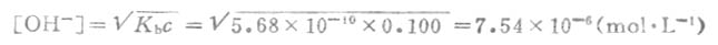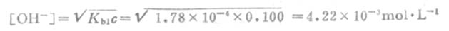 表3-5 列出了一些一元弱碱的离解常数。通过Kb和碱的浓度c(OAc-的浓度近似地等于盐NaOAc的浓度),即可根据(式2-4)计算溶液中[OH-]及PH值,而不必像经典理论那样通过盐的水解来解释和计算。