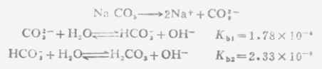 pOH=-lg[OH-]=-lg7.54*10-6=5.12 pH=14-pOH=14-5.12=8.88 多元弱酸的强碱盐溶液PH值的计算,与一元强碱弱酸盐相类似。因 Kb1》Kb2 ,溶液中[OH-]主要由第一级碱式离解所产生,而第二级碱式离解产生的OH-及弱酸很少,可以忽略。计算时以Kb1代入式(2-4)中之Kb,即可算出[OH-]。例如Na2CO3溶液中