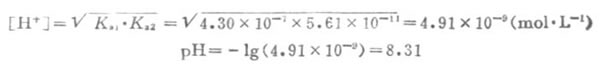 从这些近似公式可以看到,这些盐溶液的PH值与浓度无关。 例4 计算0.10mol.L-1 NaHCO3溶液的pH值。已知H2CO3的Ka1=4.30*10-7,Ka1=5.61*10-11。 解:由符合近似条件,故可用近似公式计算。