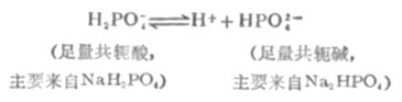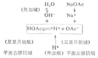 在缓冲溶液中加入少量强酸(如HCL),则增加了溶液的[H+]。假设不发生其他反应,溶液的PH值应该减小。但是由于[H+]增加,抗酸成分即共轭碱OAc-与增加的H+结合成HOAc,破坏了HOAc原有的离解平衡,使平衡左移即向生成共轭碱HOAc分子的方向移动,直至建立新的平衡。因为加入H+较少,溶液中OAc-浓度较大,所以加入的H+绝大部分转变成弱酸HOAc,因此溶液的PH值不发生明显的降低。 在缓冲溶液中加入少量强碱(如NaOH),则增加了溶液中OH-的浓度。假设不发生其他反应,溶液的PH值应该增大。但由于溶液中的H+立即加入的OH-结合成更难离解的H2O,这就破坏了HOAc原有的离解平衡,促使HOAc的离解平衡向右移动,即不断向生成H+和OAc-的方向移动 ,直至加入的OH-绝大部分转变成H2O,建立新的平衡为止。因为加入的OH-少,溶液中抗碱成分即共轭酸HOAc的浓度较大,因此溶液的PH值不发生明显升高。 在溶液稍加稀释时,其中[H+]虽然降低了,但[OAc-]同时降低了,同离子效应减弱,促使HOAc的离解度增加,所产生的H+可维持溶液的PH值不发生明显的变化。所以,溶液具有抗酸、抗碱和抗稀释作用。 多元酸的酸式盐及其对应的次级盐的作用原理与前面讨论的相似。例如,在NaH2PO4-Na2HPO4溶液中存在着离解平衡: