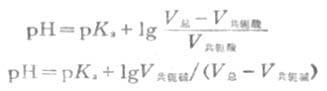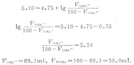四、缓冲溶液的配制在配制具有一定PH值的缓冲溶液时,为了使所得溶液具有较好的缓冲能力,应注意以下原则: 1.选择适当的缓冲对,使配制溶液的PH值在所选择的缓冲对的缓冲范围内。这个范围大约在PKa±1之内。例如HOAc-OAc-缓冲对的范围是3.7-5.6,要配制PH从3.7-5.6之间的缓冲溶液可选用这一缓冲对。 2.缓冲对中作为共轭酸的PKa,应尽量接近于配制溶液的PH值。例如,要配制PH为5.3的缓冲溶液时,可以选用HOAc-OAc=或HC8H4O4-C8H4O2-4缓冲对,因为pH5.3恰恰在这两种缓冲对的缓冲范围内。但是,前者的共轭酸的PKa 为4.75;后者共轭酸的PKa 为5.4,所以选用HC8H4O-4-C8H4O2-4配制的缓冲溶液较选用前者有更大的缓冲容量。 3.要有一定的总浓度(通常在0.05-0.20mol·L-1之间)使所配成溶液具有足够的缓冲容量,并采用适当的缓冲比使溶液的pH恰好等于所需要的PH值。 在具体配制时,为了简便起见,常用相同浓度的共轭酸碱溶液。此种情况可用式(3-13)计算所需两种溶液的体积。然后根据体积比,把共轭酸碱两种溶液混合,即得所需的缓冲溶液。设溶液的总体积是V总,则式(3-13)改写成 或 例10 如何配制100mLpH值为5.10的缓冲溶液? 解:根据配制缓冲溶液的原则,可选择HOAc-OAc-缓冲系来配制。因pH=5.10,pKa=4.75,V总=100L,故