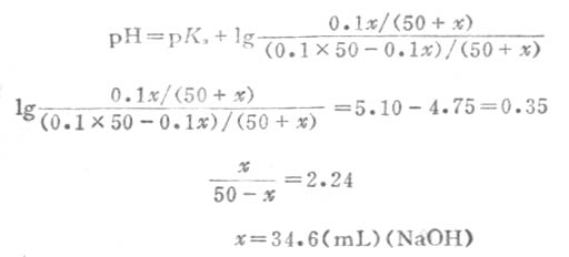 配制缓冲溶液还可采用共轭酸中加氢氧化钠或共轭碱中加盐酸的办法。两种方法都可组成有足够浓度的共轭酸碱对的缓冲溶液。 例11 欲配制pH值为5.10的缓冲溶液,计算在50mL的0.1ml.L-1HOAc溶液中应加0.1mol.L-1NaOH溶液多少mL?