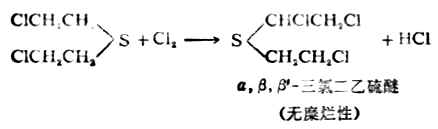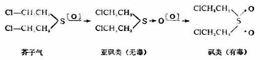 二、硫醚的构造和性质硫醚可看作是硫化氢分子中的两个氢原子都被烃基取代的化合物,通式为R-S-R。例如二甲硫醚CH3-S-CH3、甲乙硫醚CH3-S-C2H5等。 硫醚的物理性质与硫醇相似,但臭味不如硫醇那样强烈。硫醚易被氧化,而使硫的化合价从二价变为四价或六价,即硫醚第一步可氧化成亚砜,亚砜又可进一步氧化成砜。 芥子气(β,β‘-二氯二乙硫醚)是硫 芥子气是无色油状液体,沸点217℃,熔点14℃。具有芥末的气味,不溶于水,易溶于乙醇、苯等有机溶剂。 漂白粉能与芥子气起氧化、氯代反应,将芥子气变为毒性较小的亚砜等产物。