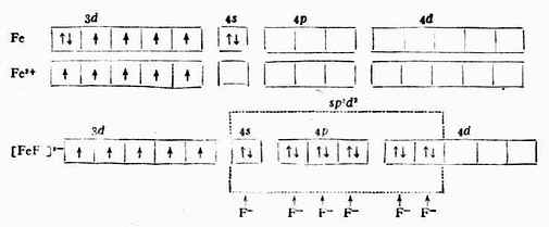 例3 [FeF6]3- 当Fe 3+和6个F-形成[FeF6]3-配离子时,磁矩未变,说明配离子中仍保留有5个未成对电子。配位键理论认为:Fe 3+利用外层的一个4 s 轨道、3个4p轨道和2个4d轨道与6个配位体F-成键,故所形成的[FeF6]3-配离子属外轨型,它的外层电子结构为: ①原子或离子的磁矩μ与原子中未成对电子数n有如下近似关系: