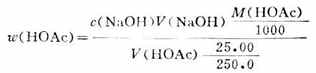二、酸碱滴定法的应用实例在实际工作中常用的酸溶液主要是HCL溶液,有时也用H2SO4标准溶液。常用的碱溶液是NaOH标准溶液。由于这些试剂价廉易得,加之酸碱滴定法操作简便,分析速度快和结果准确。因而在工农业生产及科学实践中得到广泛应用。在临床检验上常用以测定尿液、胃液及其他体液的酸度。在卫生分析方面也常用以测定各种食品的酸度等。下面介绍一些实例。 (一)食醋中总酸度的测定 食醋约含3%-5%的HOAc,此外,还含有少量其他有机酸。当用NaOH滴定量,所得结果为食醋的总酸度,通常用含量较多的HOAc来表示。滴定反应如下:HOAc+NaOH→NaOHc+H2O 达到化学计量点时溶液显碱性,因此常选酚酞作为指示剂。 操作步骤:用移液管吸取Vml食醋置于250ml容量瓶中,用蒸馏水稀释至刻度,充分摇匀。再用移液管吸出25.00ml放在250ml锥形瓶中,加酚酞指示剂2滴,用NaOH标准溶液滴定,不断振摇,当滴至溶液呈粉红色且在半分钟内不退色即达终点。重复操作2-3次,按下式计算食醋中HOAc的质量分数。
