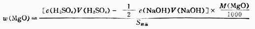 (二)氧化镁含量的测定 因为固体氧化镁难溶于水,所以在测定试样中氧化镁含量(质量分数)时,采用剩余量滴定法。即先称取一定量的待测样品溶于过量且已知准确体积的酸标准溶液中,待反应完全后,用标准碱溶液滴定剩余的酸,反应如下: MgO+H2SO4(过量)→MgSO4+H2O 2NaOH+H2SO4(乘余) →H2SO4+2H2O 操作步骤:称取约1g(准至0.1mg)左右样品置于锥形瓶中,加入c(H2SO4)=0.5000mol·L-1标准溶液50.00ml,振荡使其溶解,加入甲基橙指示剂2滴,用0.1000mol·L-1NaOH标准溶液滴定剩余的硫酸。当溶液由红变为橙色即为终点。 加入硫酸的总量为: