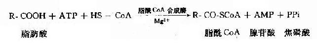 (一)脂肪酸的β-氧化过程此过程可分为活化,转移,β-氧化共三个阶段。 1.脂肪酸的活化 和葡萄糖一样,脂肪酸参加代谢前也先要活化。其活化形式是硫酯:脂肪酰CoA,催化脂肪酸活化的酶是脂酰CoA合成酶(acyl CoA synthetase)。