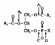 (三)甘油磷脂的分解在生物体内存在一些可以水解甘油磷脂的磷脂酶类,其中主要的有磷脂酶A1、A2、B、C和D,它们特异地作用于磷脂分子内部的各个酯键,形成不同的产物。这一过程也是甘油磷酯的改造加工过程。